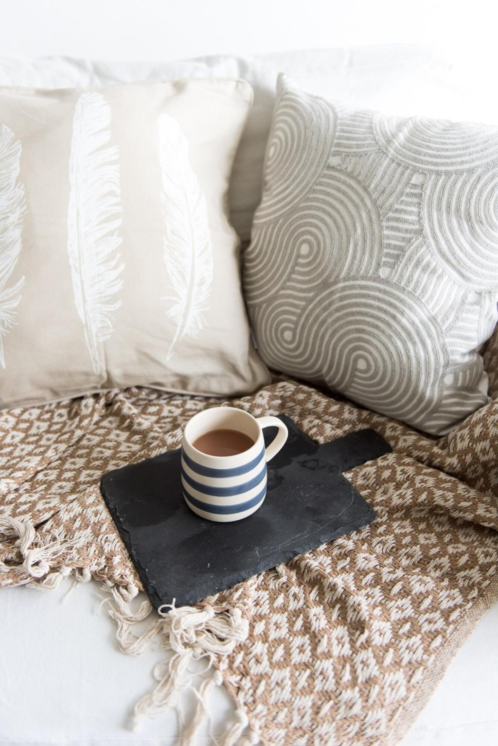 Create a headboard effect with a fabric-wrapped panel or a wide shelf mounted with command fasteners. The horizontal line calms the wall and frames the bed, giving structure without heavy furniture or drilling.